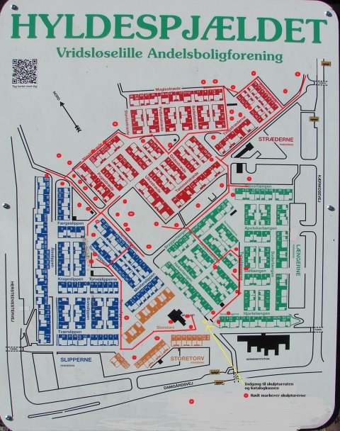Kort over Hyldespjældet. Rød rute hvor skulpturerne står